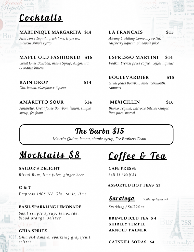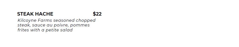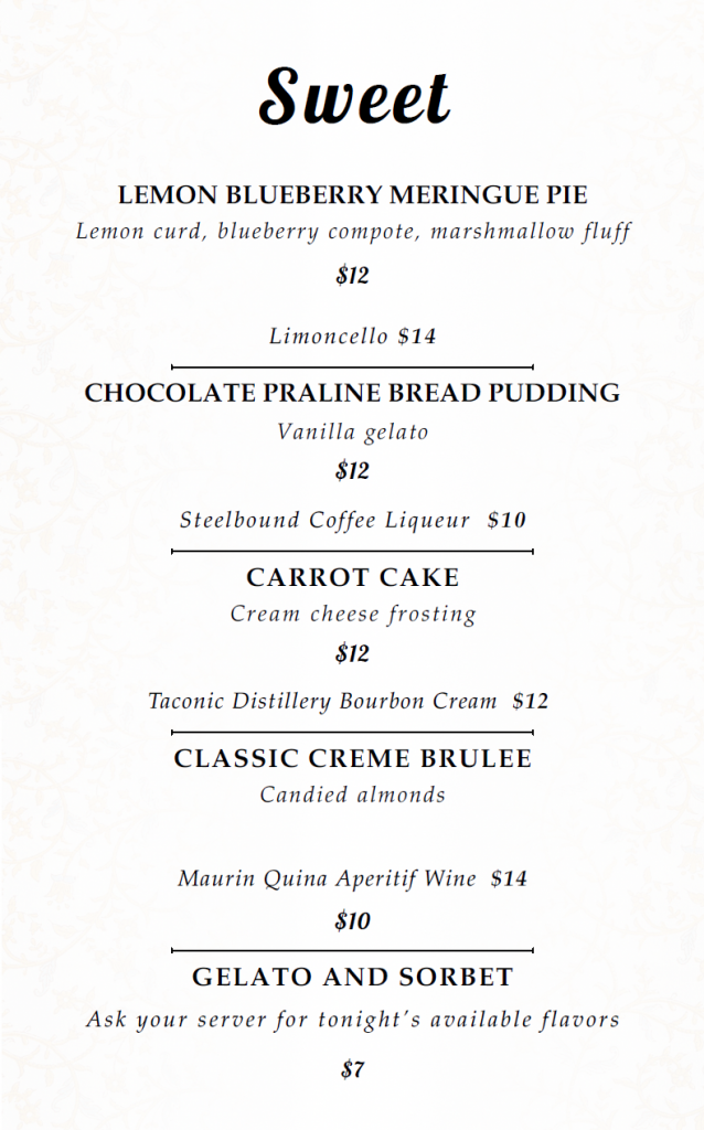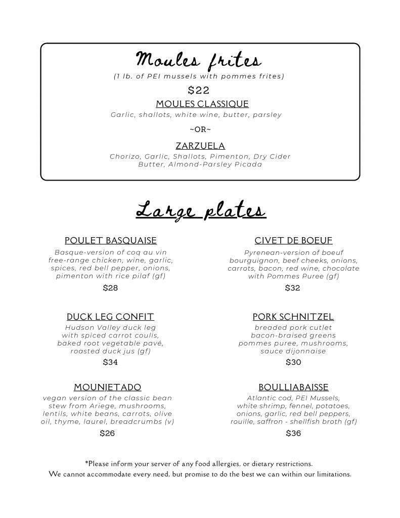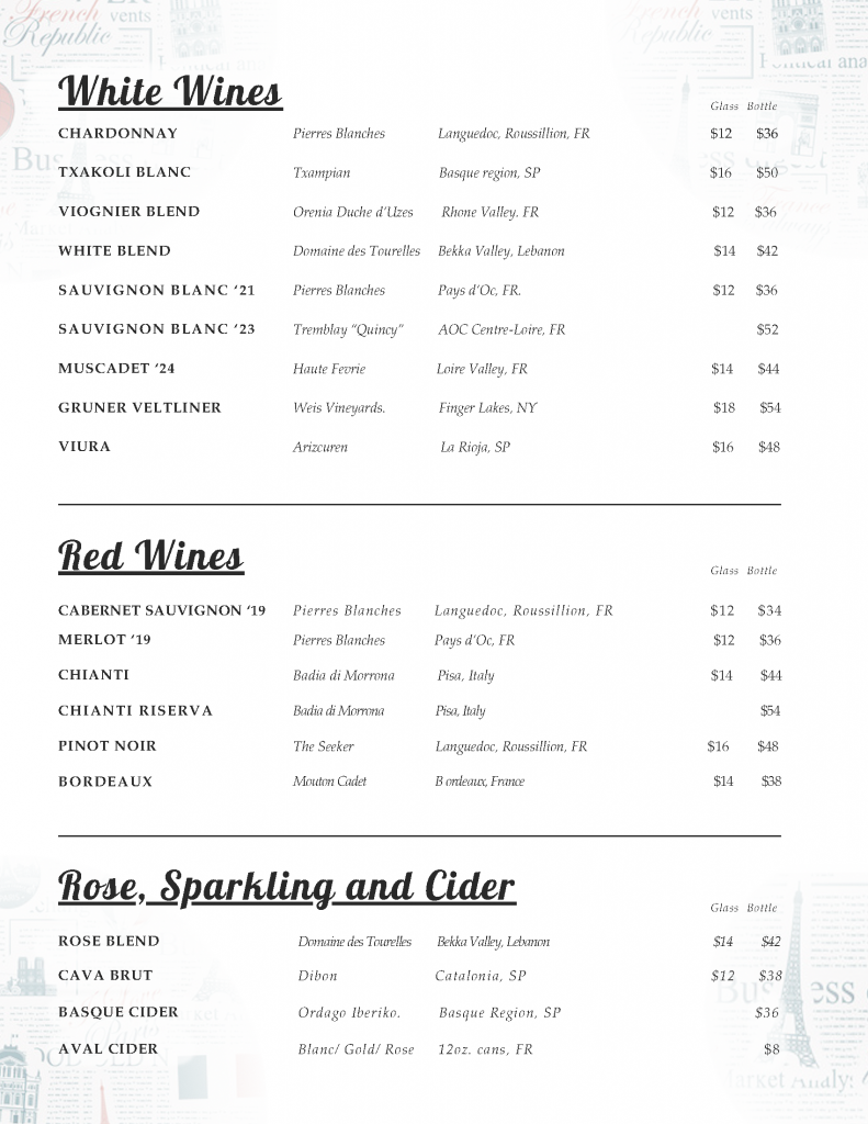 Our menu changes regularly, please feel free to call us with any questions.