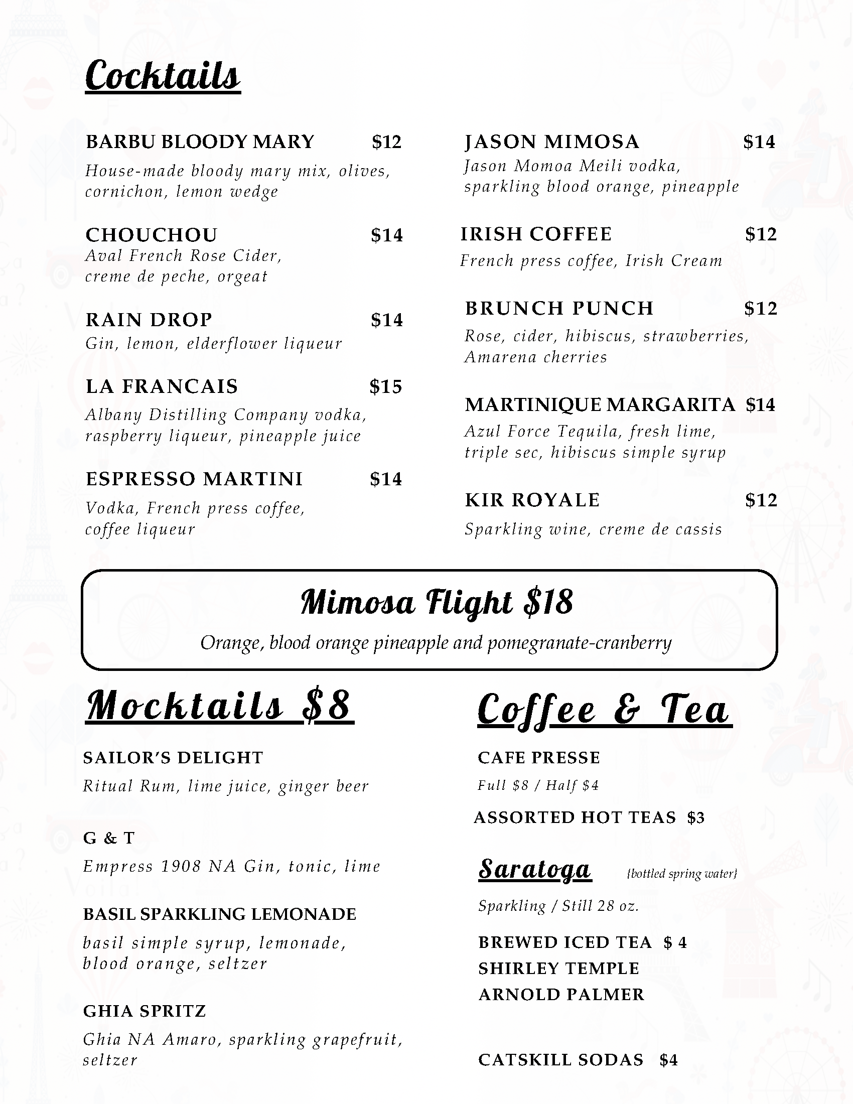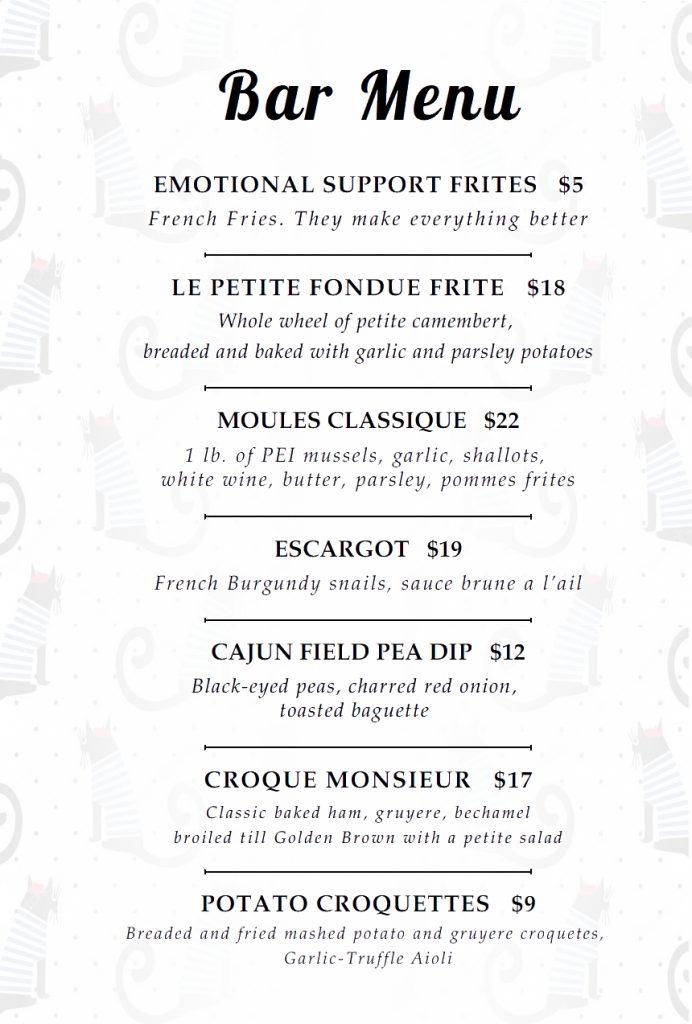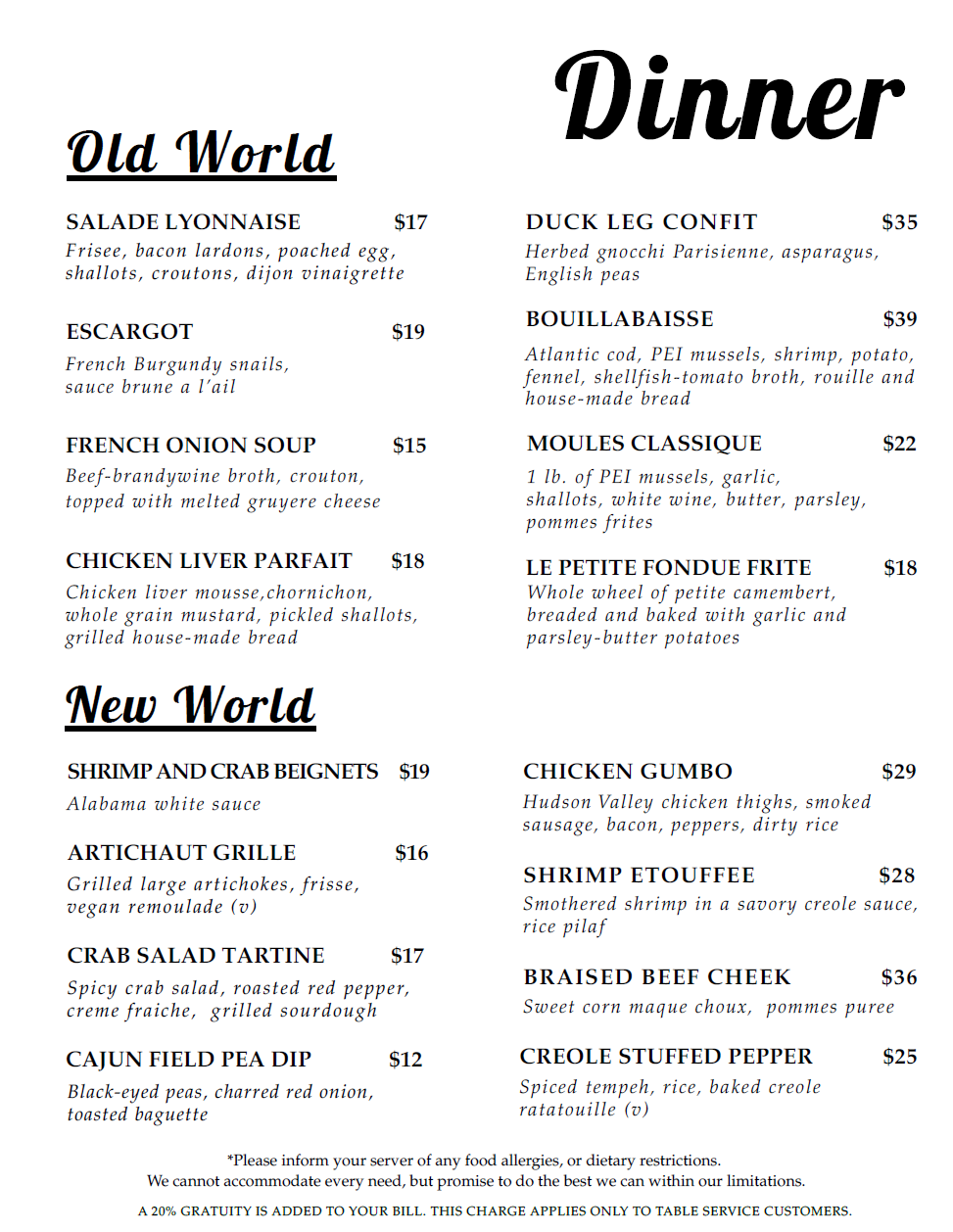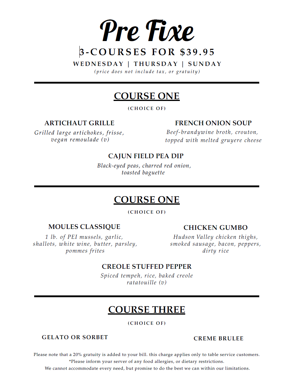 Our menu changes regularly, please feel free to call us with any questions.
